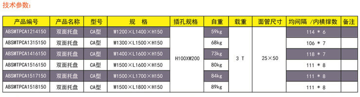 CA型圓角雙面鋼托盤 產品用途:主要為大批量軟包裝物品存儲和周轉設計(袋裝)。采用圓角工藝,完善傳統式四個尖角焊接,主要防止麻袋在放置時不容易刮破。